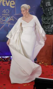 La actriz ha cautivado con un estilismo de impecable factura artesanal, fruto de 160 horas de confección. El conjunto, diseñado por Cristina Valenzuela, incluía un abrigo de raso en tono marfil con mangas inspiradas en los mosaicos de Gaudí y un vestido columna de crepé que estiliza la figura. La combinación de tejidos y referencias artísticas aportaba carácter y sofisticación al conjunto. Completó su imagen con joyas de Del Páramo Vintage y zapatos de terciopelo firmados por Lodi.