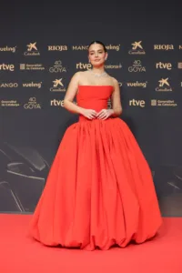 La influencer ha confiado en la firma catalana Yolancris para su segunda aparición en los Premios Goya. Lució un vestido rojo de corte princesa, con amplia falda y escote palabra de honor de estructura marcada, confeccionado en crepé. La pieza, que había contemplado previamente para otro evento, encontró finalmente su momento sobre la alfombra roja. Acompañó el diseño con sandalias de Martinelli en colaboración con Redondo Brand, joyas de Quera y un maquillaje firmado por Dior Beauty, completando un look vibrante y elegante.